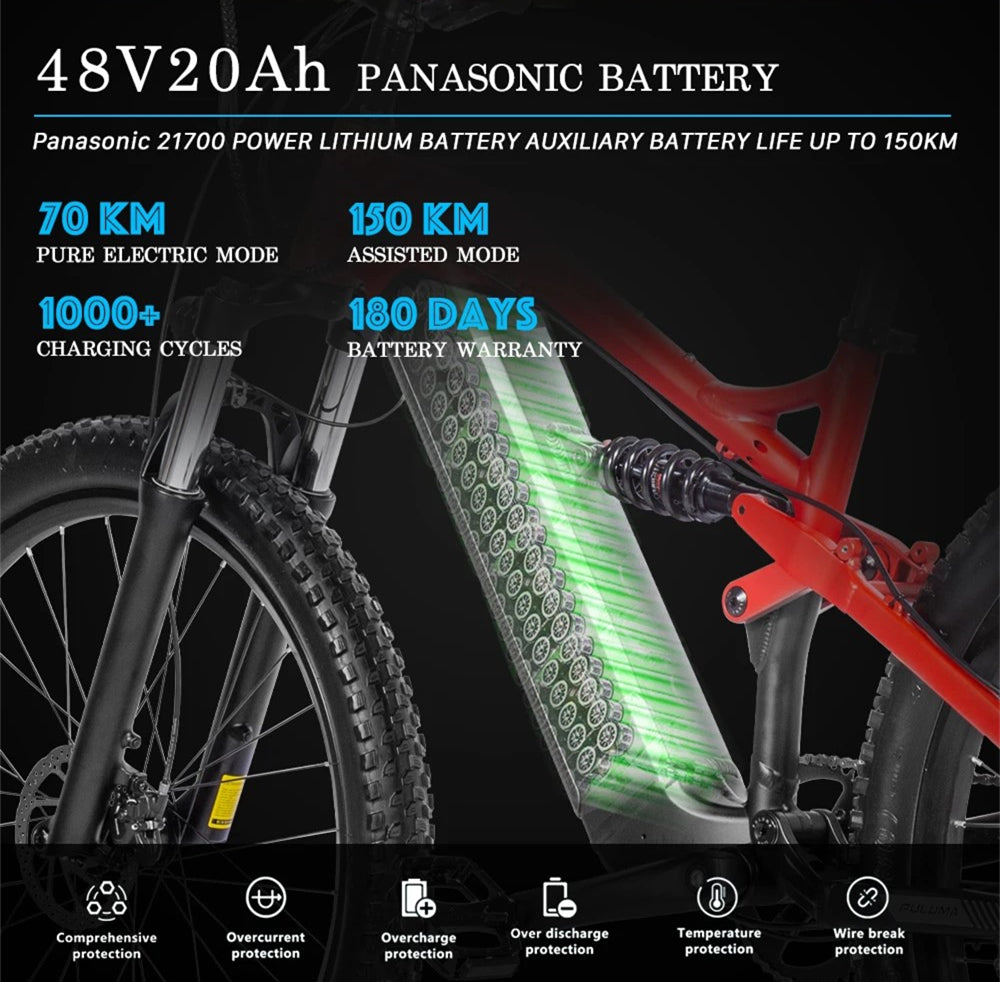 1.The Panasonic 48V/20AH removable lithium battery can be charged at home or in the office.After fully charged, you can ride about 40 to 50 mile. (According to the rider's weight, road conditions, wind speed, weather and other factors)