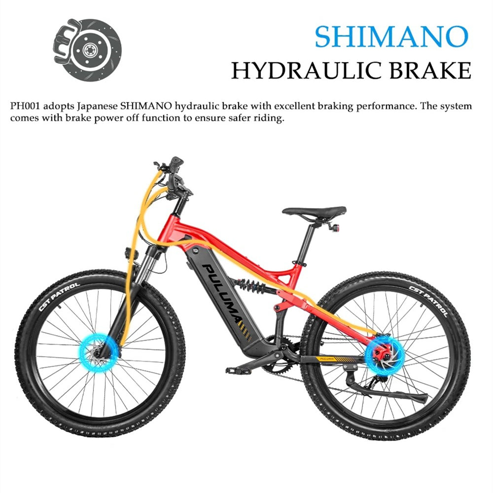 [Shimano hydraulic oil brake] Front and rear hydraulic disc brake design provides powerful braking capability. The automatic brake power-off function will ensure your riding safety.